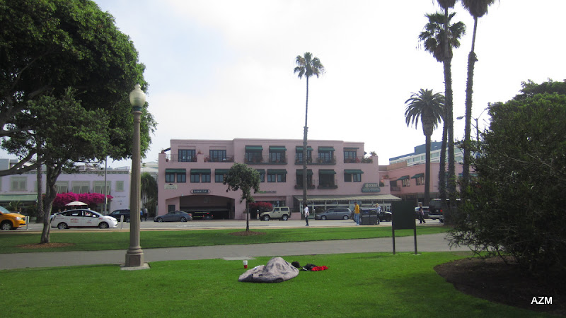 Tego dnia wisiala nad miastem mgla i nie bylo dobrej widocznosci. Co dalo sie zauwazyc w parku nad woda, ze jest tam bardzo duzo bezdomnych. Spali na srodku trawnikow w wielu miejscach. Mimo wczesnej pory bylo juz troche ludzi na plazy i spacerowalo po molo. Na szczescie wialo nad woda, wiec nie ugotowalismy sie od razu. Po Nowym Jorku mielismy szok termiczy ;-)